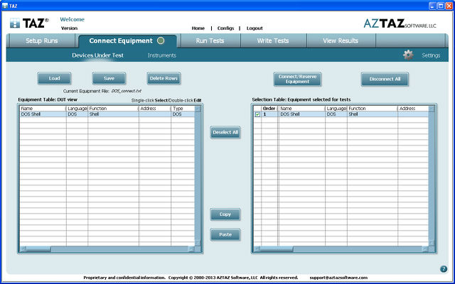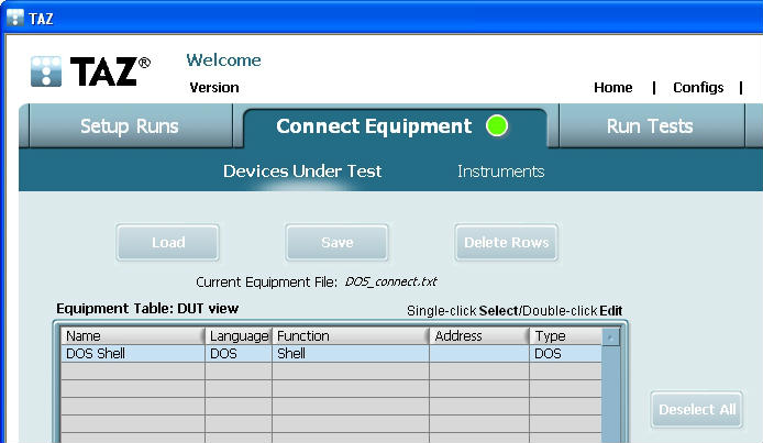 A: Once your test is written down, note the different equipment that you used, physical and virtual. This may be one or more DUTs, test equipment, or even a DOS shell. You will enter connection information for this equipment in the Equipment Table on the TAZ Connect Equipment screen.