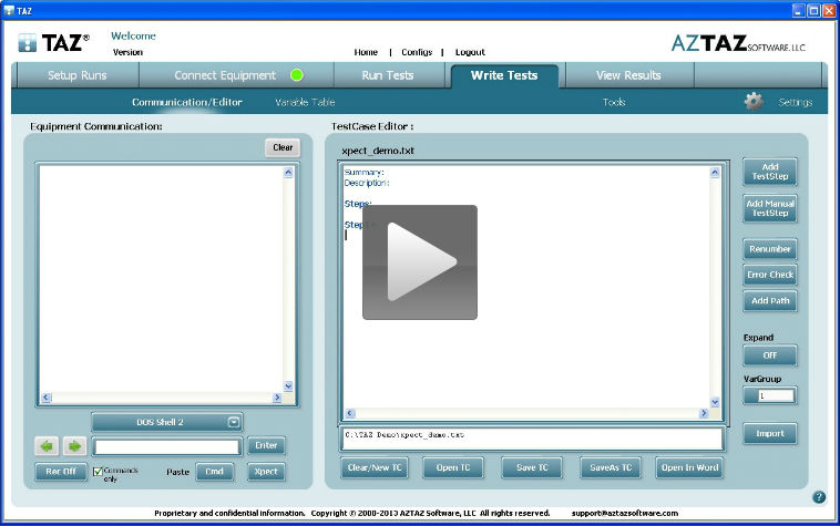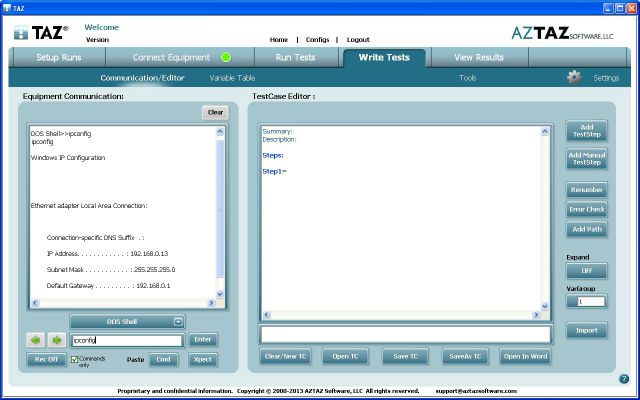 A: Yes. If you have a list of commands in a text document, one per line, you can use the Import button on the WRITE TESTS screen. TAZ will enter these in the current TestCase at the cursor location and direct the commands to the selected piece of connected equipment.